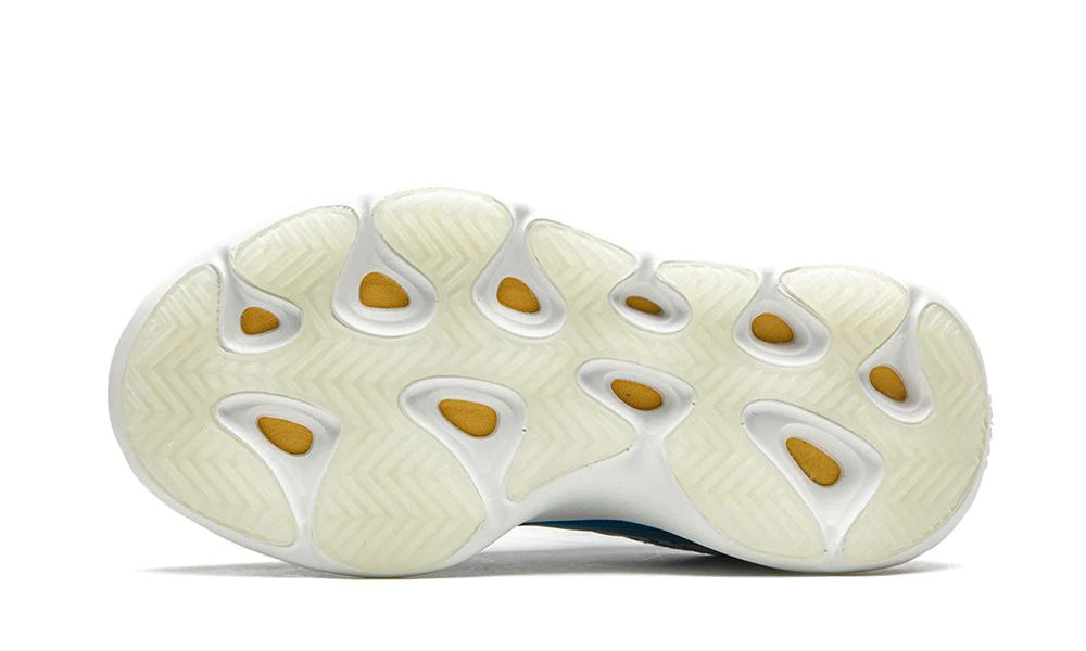 The Yeezy 700 V3 debuted in 2019 as an evolutionary version of the original Yeezy Boost 700. Redesigned style elements include the removal of Boost cushioning in the midsole in favor of lightweight EVA foam and an added RPU cage for stability. The shoe’s blue “Azareth” Primeknit upper is contrasted by sections of white and dark green fabric. A futuristic glow-in-the-dark treatment is applied to the translucent overlay cage. Release date: August 29, 2020.