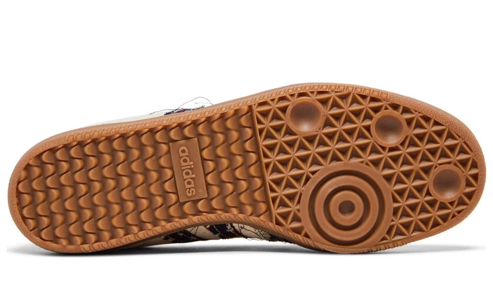 The END. x adidas Samba ‘Consortium Cup’ features a cream-hued suede upper with a tonal forefoot overlay in woven fabric. Patterned textile in a multicolor design, complete with frayed edges for a DIY-inspired look and feel, appears on the signature three-stripes and back tab. ‘Past’ is inscribed in metallic gold lettering on the lateral quarter panel — a nod to traditional weaving techniques of yesteryear — while the END. logo is stamped on the back heel. The sneaker rests on a traditional gum rubber cupsole.