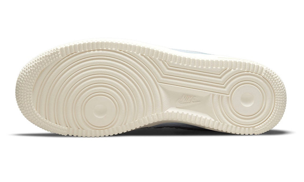 Uppers feature lightweight waterproof fabrics with exposed stitching accents and stacked overlays across the eyelets. Powder blue hues are found on a nylon strap that sits above the midsole and on the toggle lacing systems on the tongue and heel. Branding elements come in the form of small and large swooshes on the laterals, an “AF1” tag on the eyelet cover, and an ankle patch featuring “Nike AF1 1982” text and coordinates. A top view reveals a fleece insole, and a sail white elevated sole unit below completes the look.