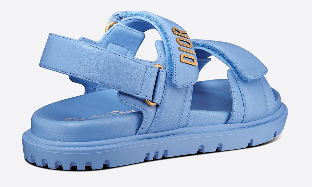 The DiorAct sandal features a modern silhouette in cornflower blue lambskin. The style features an anatomically-shaped sole which is ultra lightweight and comfortable. Scratch straps enhanced by a gold-finish metal 'DIOR' signature on the upper band complete the design. The sandal will lend a contemporary touch to any look.