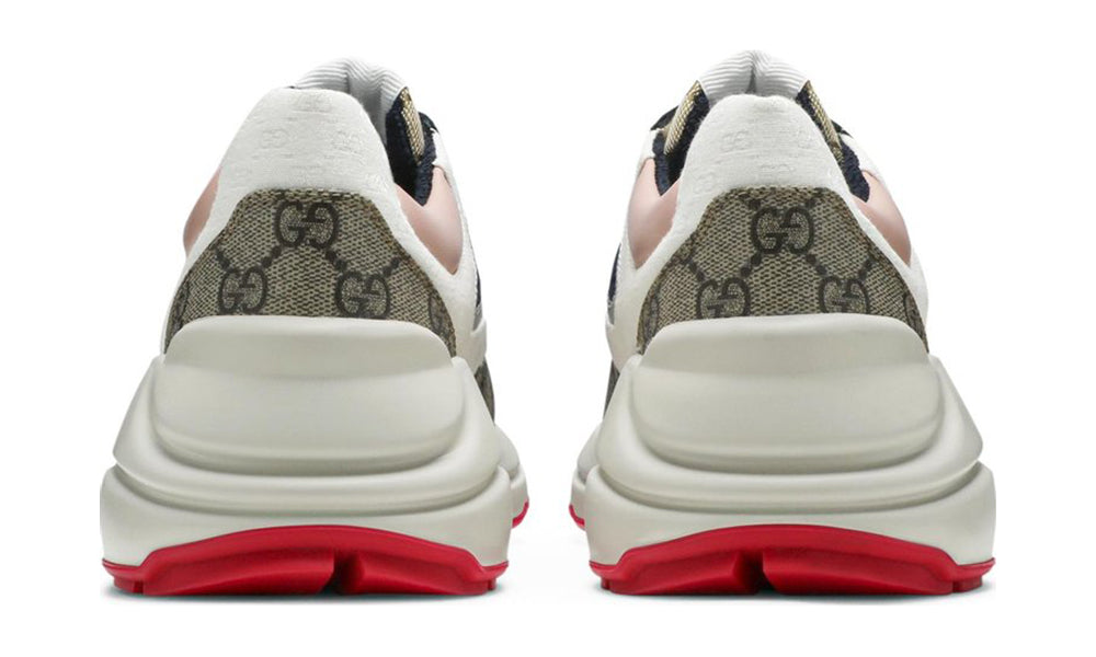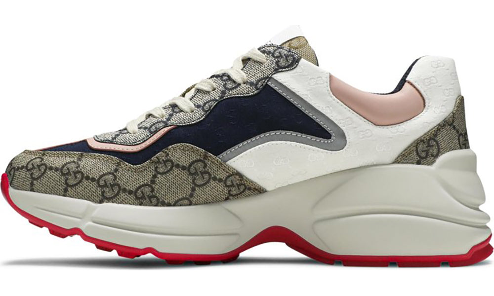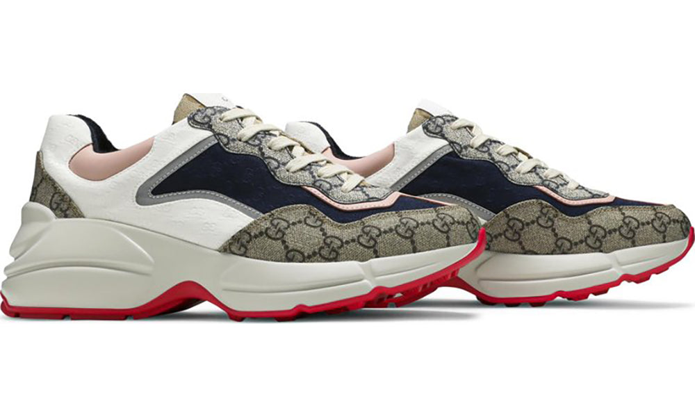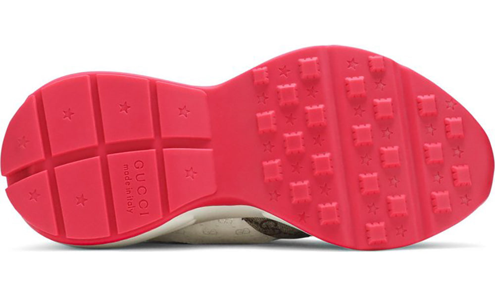 Gucci’s brown Rhyton trainers are defined by colourful patchworked GG Supreme panels for a retro, maximalist approach and have a striking pink rubber sole.
