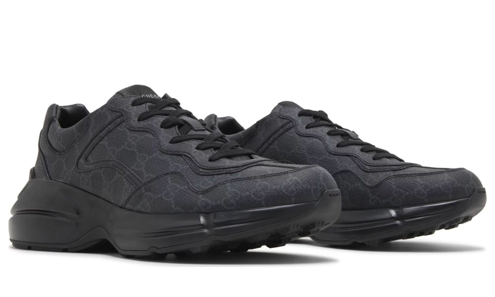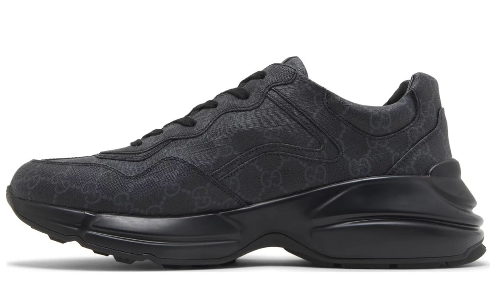 Reimagining the material's historic origins, GG Supreme is presented in black as part of Gucci Love Parade. The canvas has come to the front of each collection decade after decade to become a hallmark of the House. Here, the classic palette defines this pair of Rhyton sneakers.