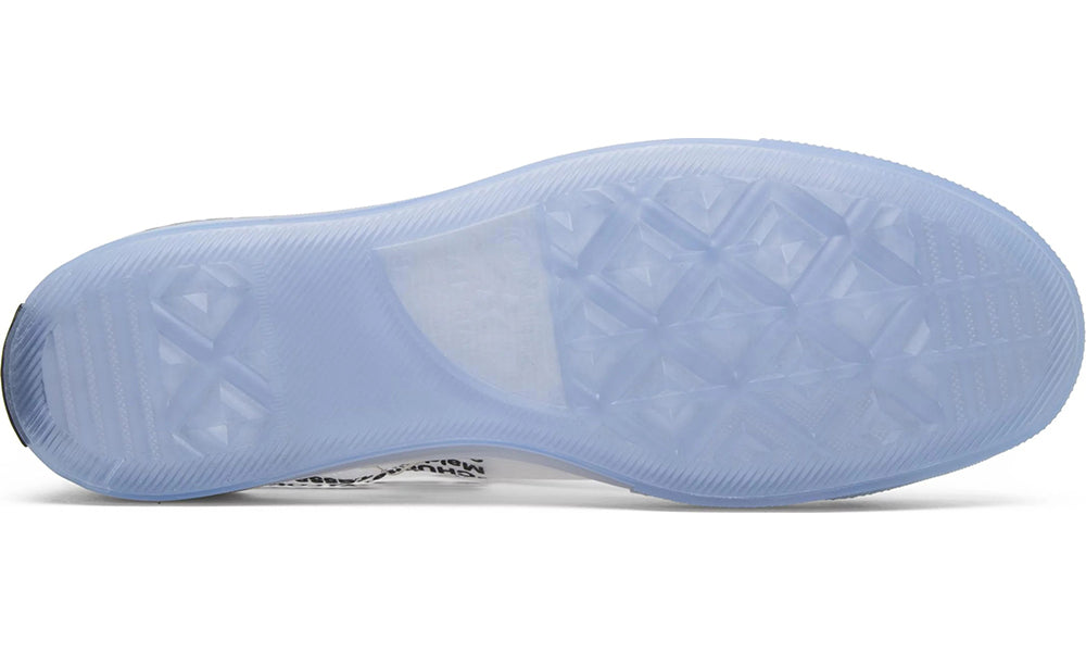 The final pair of Virgil Abloh's 'The Ten' collection, the Off-White x Chuck Taylor All-Star 70 was released in May 2017 as part of the 'GHOSTING' pack. Featuring a translucent white upper and an ice-blue gradient on the sole, the shoe features bold lettering along its silhouette: "LEFT" and "RIGHT" on the toecaps, “VULCANIZED” over the midsole, “SHOELACES” on each lace, with Off-White's stamp on each side-panel. A red zip-tie hooked through the laces completes the look.