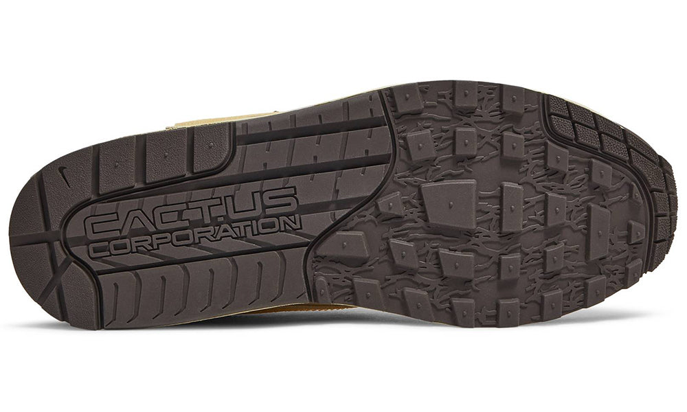 The Travis Scott x Nike Air Max 1 ‘Baroque Brown’ treats the iconic retro runner to a rugged outdoor-inspired makeover. Red hiker-style laces secure a cream-colored mesh upper with dark tan leather overlays and a brown nubuck mudguard. Scott’s signature reverse Swoosh decorates the lateral quarter panel in a Lemon Drop finish, while multicolor woven straps are integrated into the laces and heel overlay. The latter features a crimson triangular patch, accented with Cactus Jack branding on the right shoe and a classic Nike logo on the left. The sneaker is mounted on a two-tone foam midsole, fitted with Air-sole cushioning in the heel and supported by a waffle-traction rubber outsole.