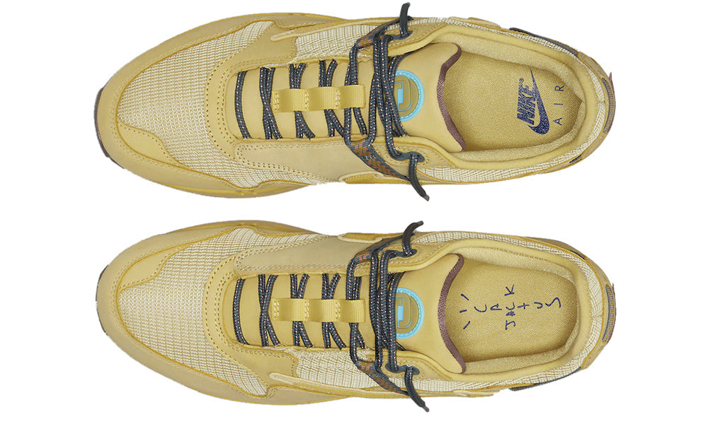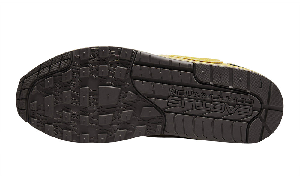 The Travis Scott x Nike Air Max 1 ‘Saturn Gold’ features a monochrome yellow palette throughout an upper crafted from breathable mesh with stitched leather overlays. Outdoor-inspired details include two-tone rope laces and brown webbing straps integrated into the laces and heel overlay, branded with mismatched Nike and Cactus Jack logos. A rubberized Cactus Jack patch adorns the tongue, while Scott’s trademark reverse Swoosh adorns the sneaker’s lateral side. The one-note finish extends to a wedge-shaped foam midsole with Air-sole cushioning in the heel and a waffle-tread rubber outsole underfoot.